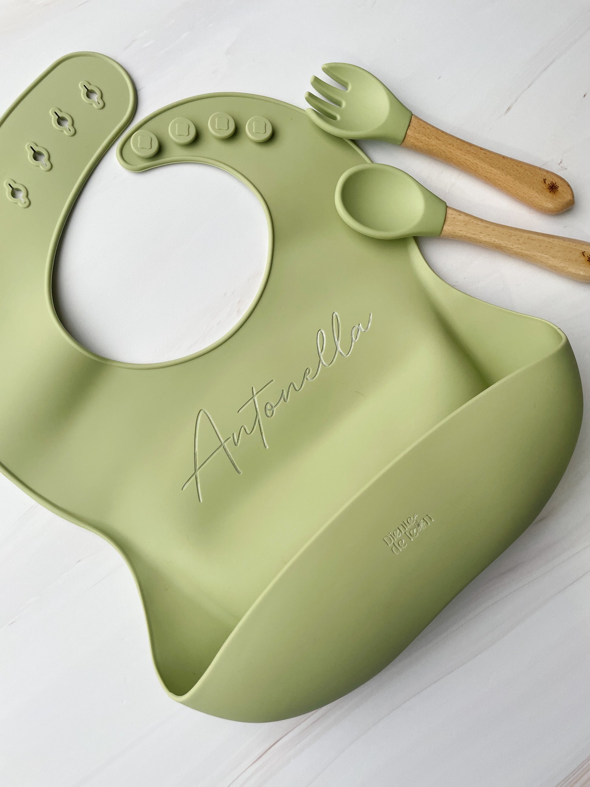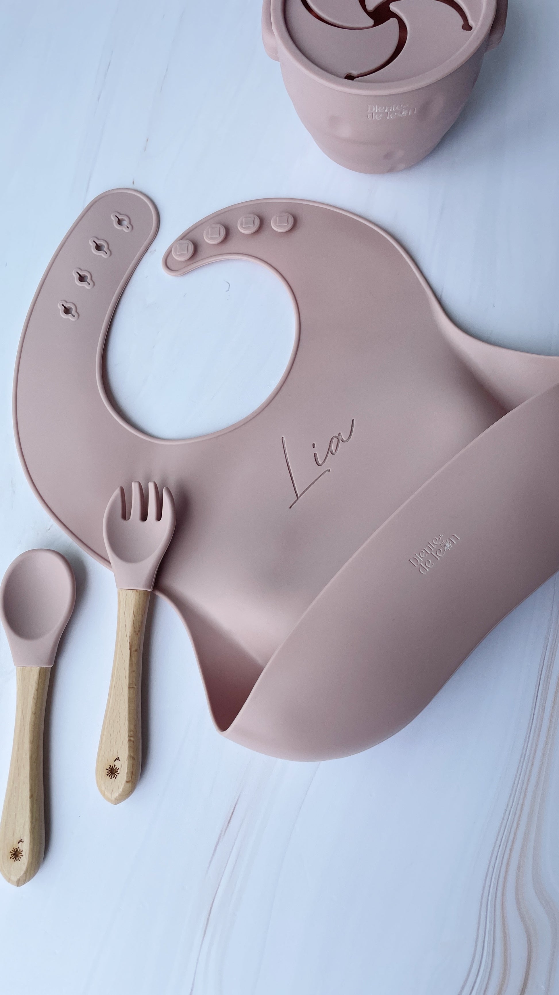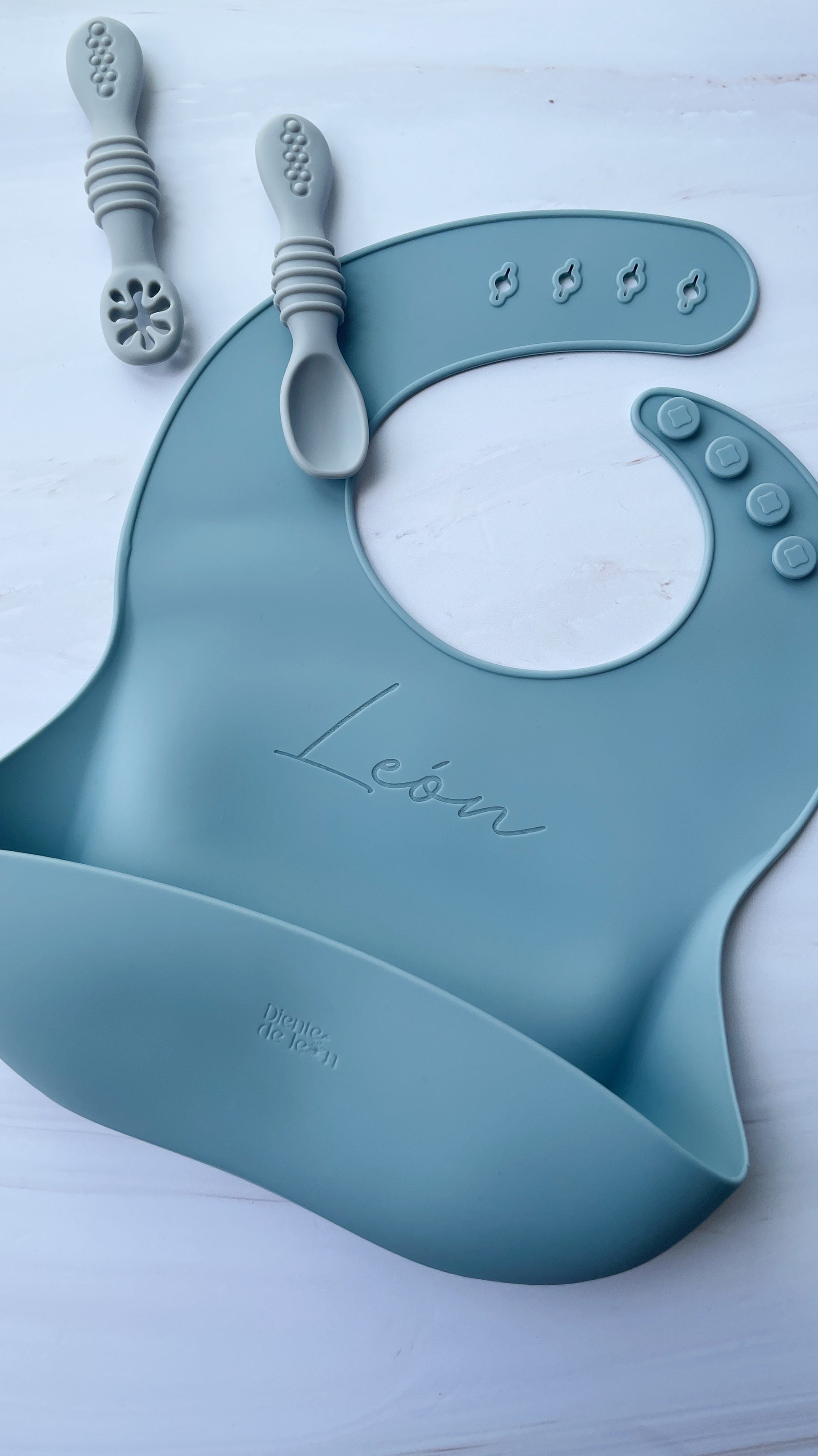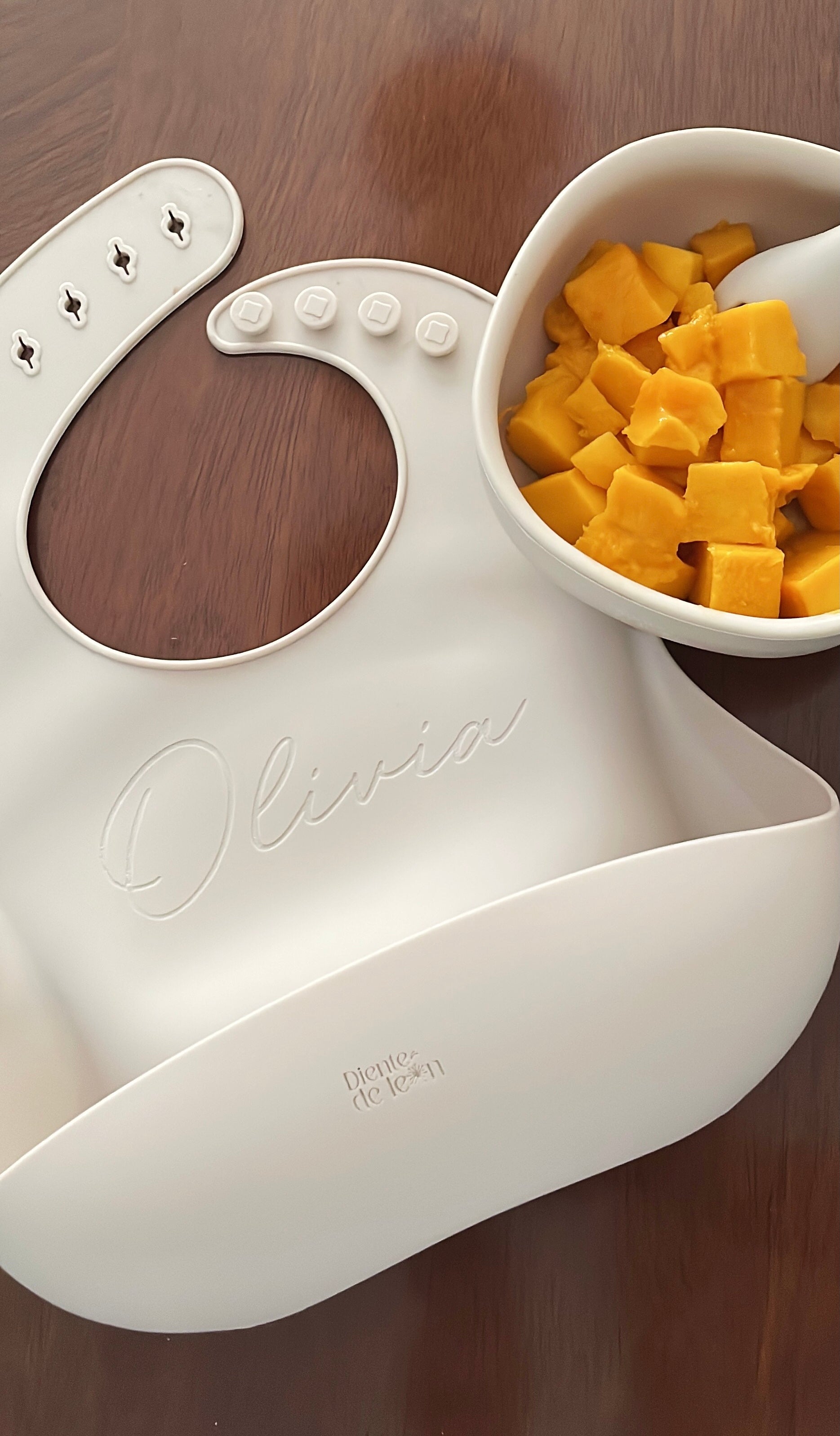 Complementa los utensilios de tu bebé con nuestro babero recolector de comida.